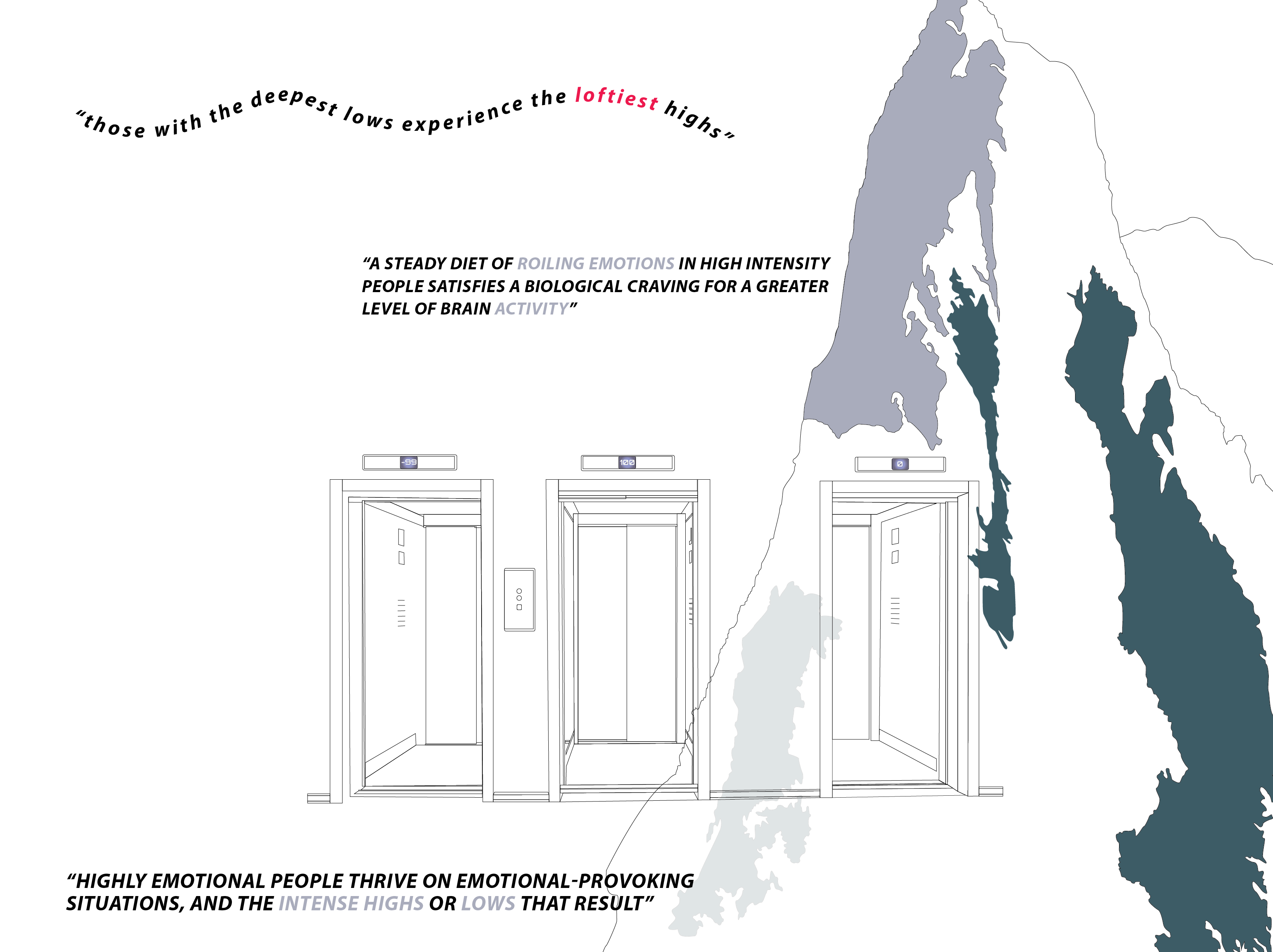 There is an elevator going from 0 to 100, a mountain that peaks to the top, and then an overhanging crevice that drops into nothingness. Strewn about are depictive texts and helpful insights into the emotional states that the viewer/reader/user might be able to relate to; they are placed on the page in ways that the viewer can grab on to as they require it, like life preservers of advice and insight.