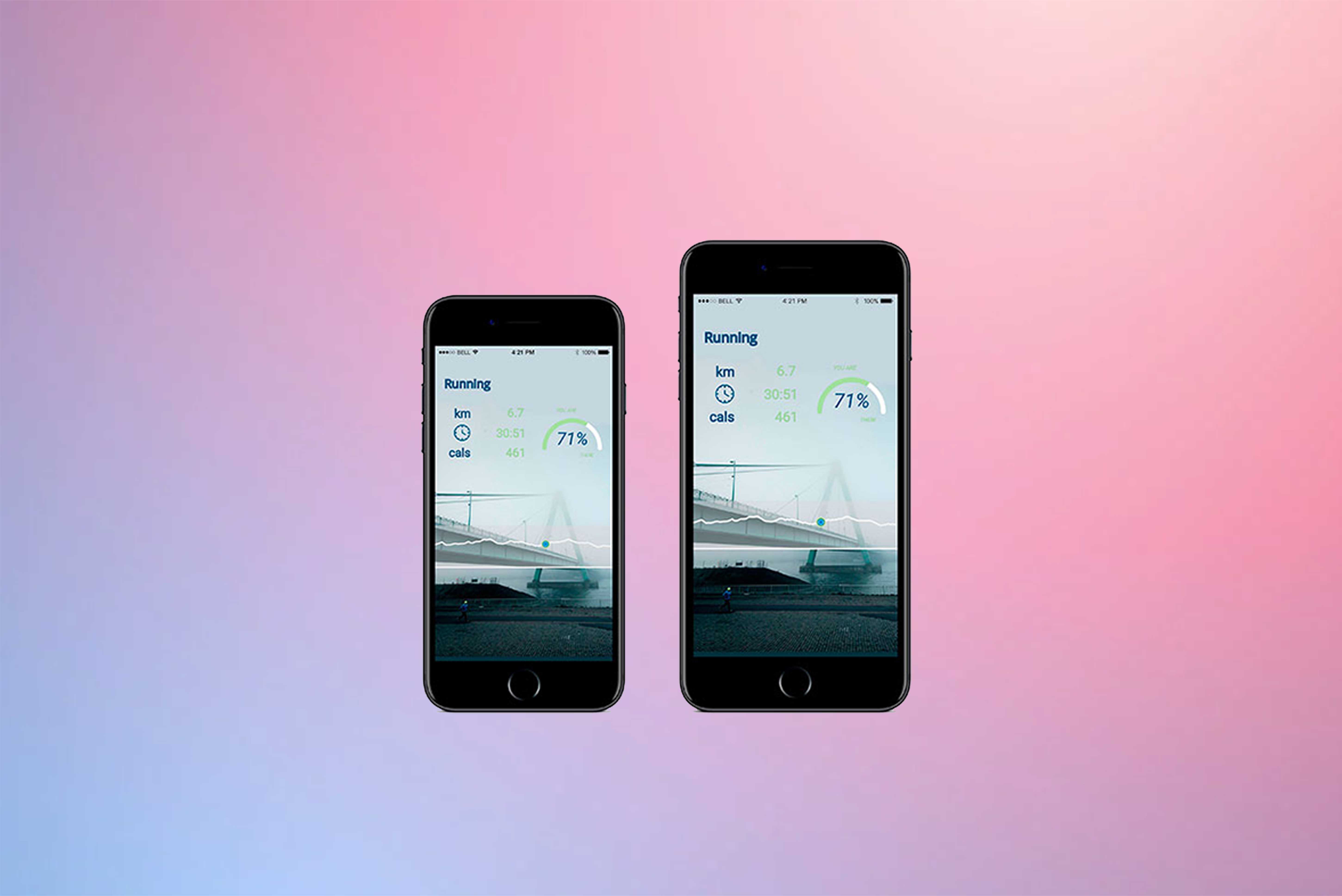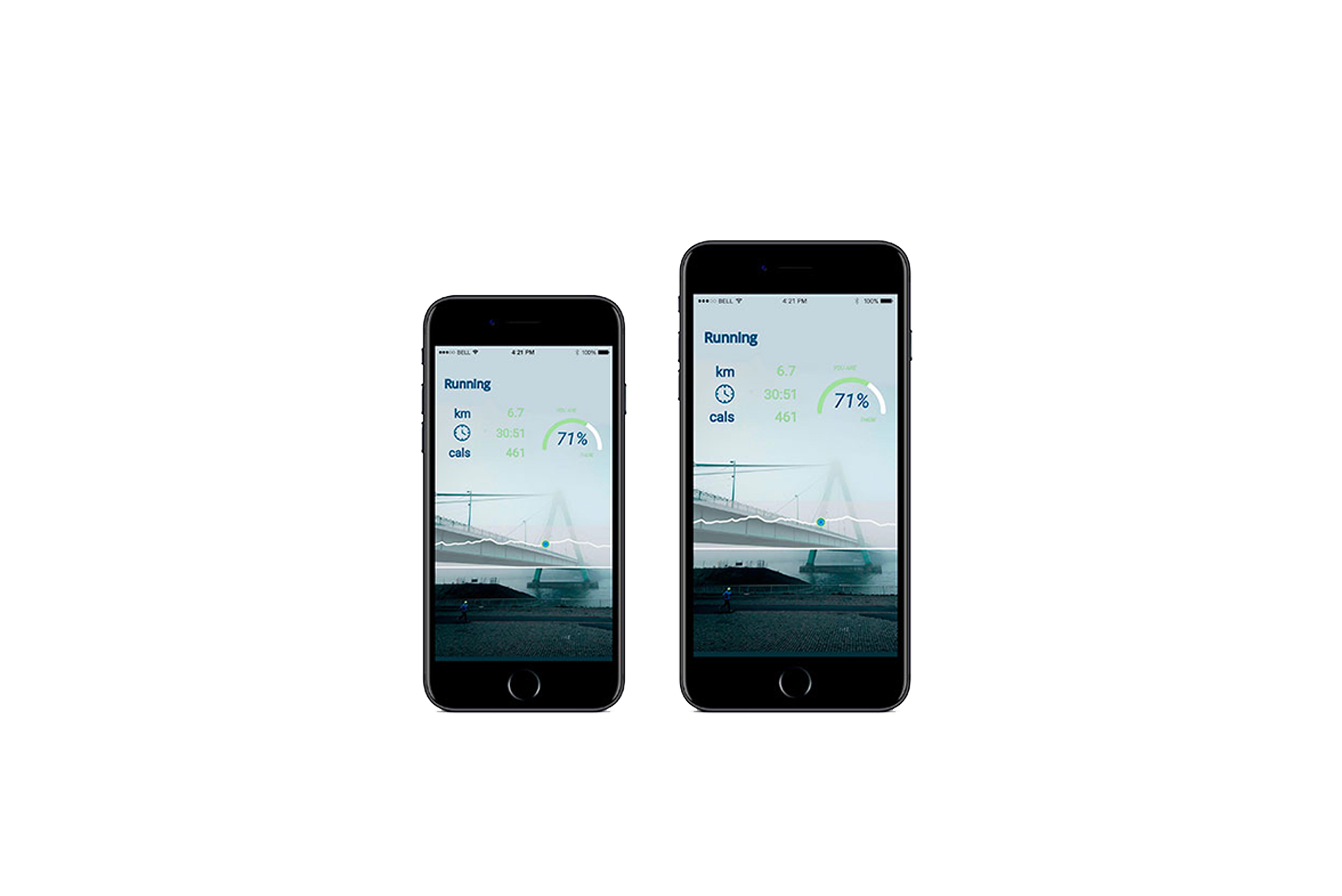 The first screen is the initial landing and log in page. The second screen is a fitness tracker logging distance, time, location and calories burned.